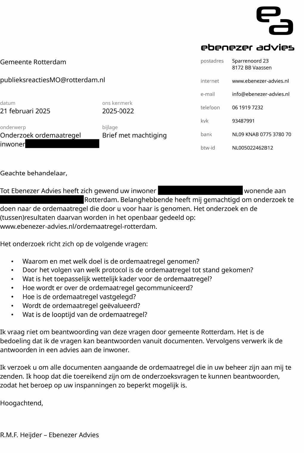 Op 21 februari 2025 schrijven we voor het eerst gemeente Rotterdam aan. Hiermee maken we bekend dat we onderzoek doen naar een ordemaatregel die de gemeente voor een inwoner heeft genomen. We geven aan dat we het onderzoek en de (tussen)resultaten openbaren en we vragen om toezending van documenten.